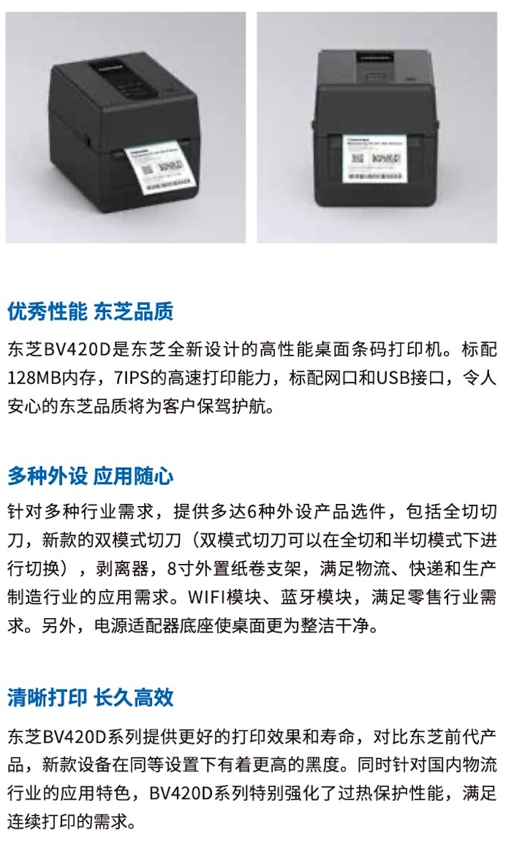 东芝BV-420D系列稳固耐用,打印快速,匹配不断增长的印务需求。外观精致小巧,节省宝贵的桌面空间,配合丰富的可选件,适配多种打印应用软件。强大性能和耐久性设计结合,将成为您的智慧之选。